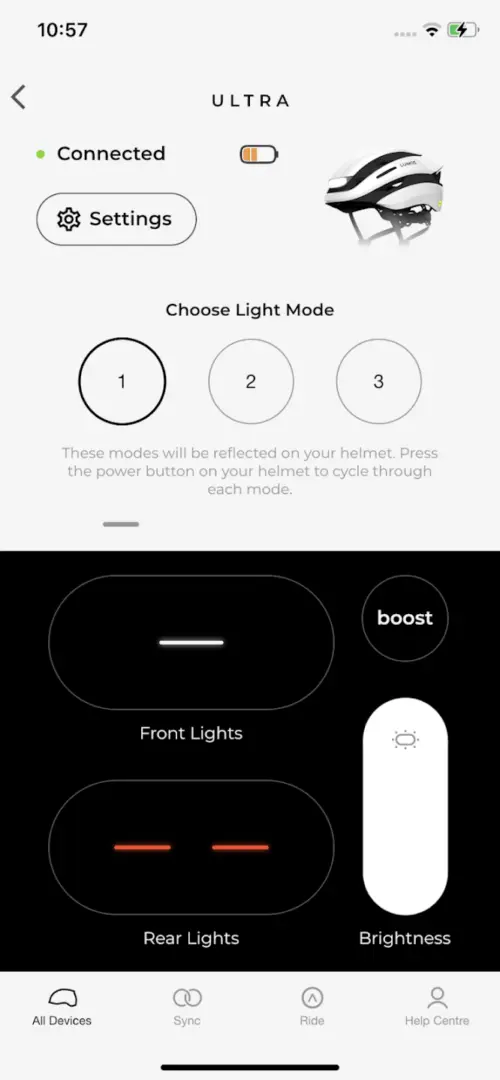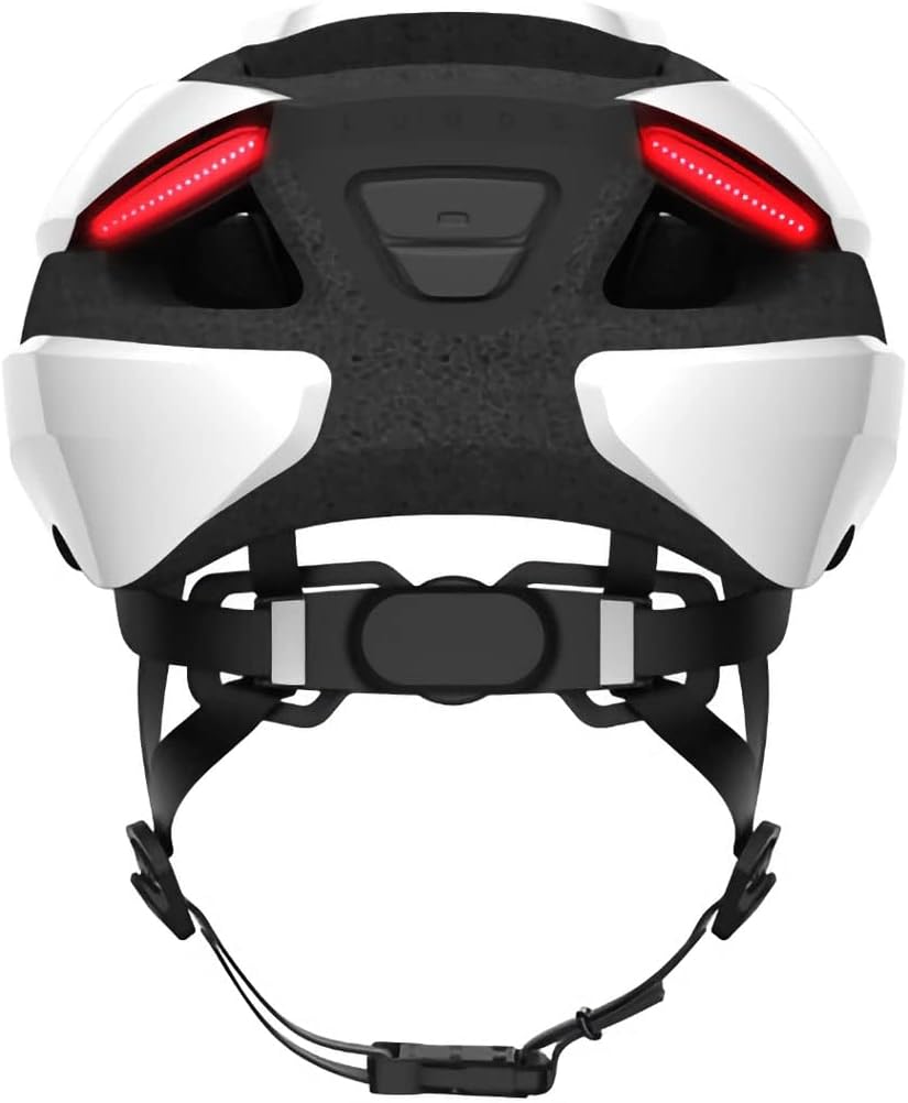 LUMOS Ultraの最大の特徴は、前後から最大300ルーメンで光る視認性の高さです。フロントには30個のホワイトLED、リアには64個のLEDが内蔵されており、360度どこからでも光が確認できます。