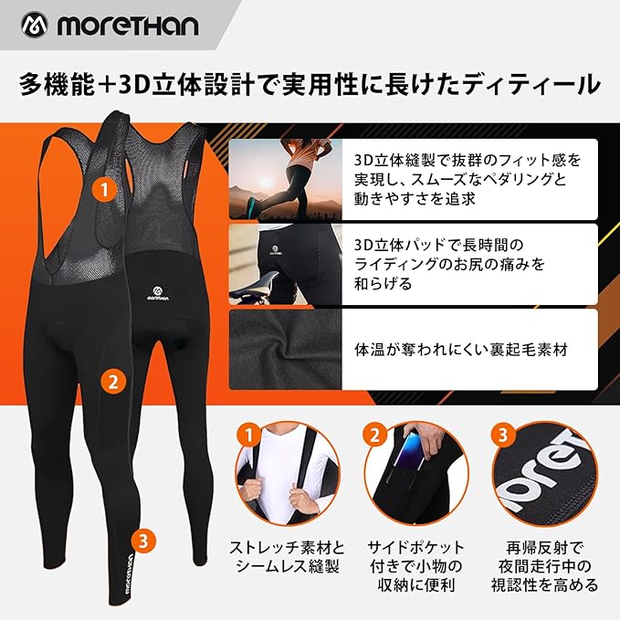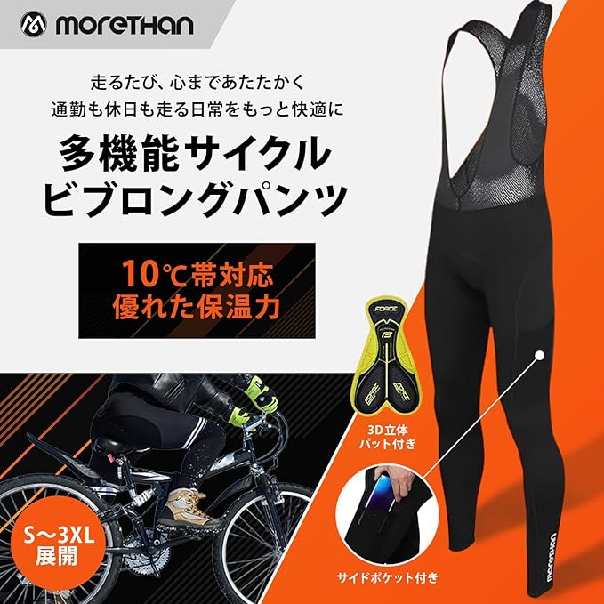Morethan BVP-008は、約6,800円という価格で裏起毛、3Dパッド、サイドポケットを備えた冬用ビブパンツです。広島発の日本ブランドで、Amazonでは4.2/5の評価を獲得しています。