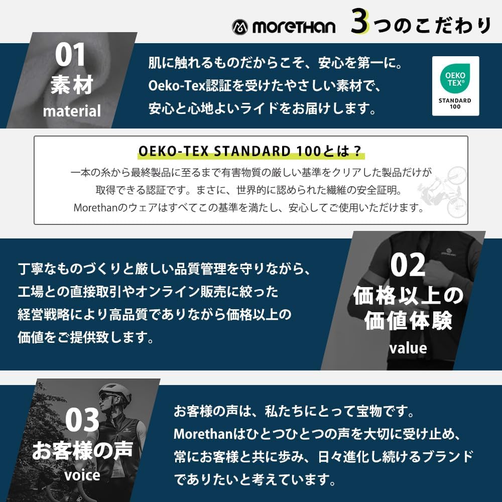 有名ブランドのサイクルジャージが1〜4万円する中、Morethanは3,500円〜9,000円という価格帯で展開。それでいてOeko-Tex Standard 100認定素材を使用するなど、品質面でも妥協していない点が評価されています。