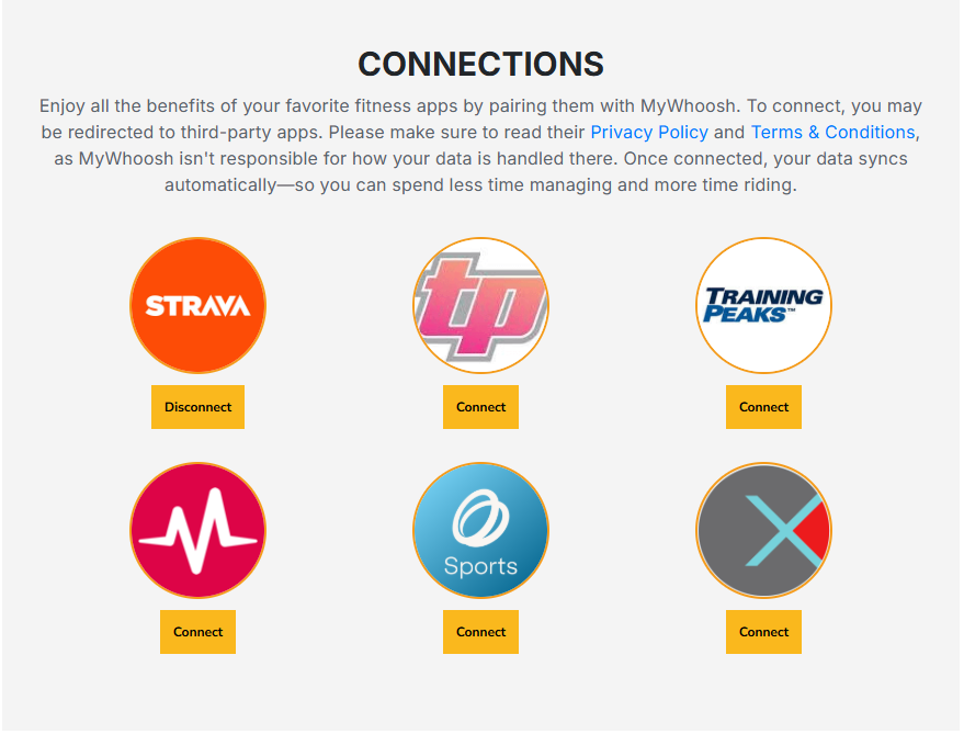 連携設定はアプリ内ではなく、MyWhoosh公式サイトから行います。ブラウザでmywhoosh.comにログインし、「CONNECTIONS」ページを開きます。Strava、TrainingPeaks、その他のサービスが表示されるので、連携したいサービスの「Connect」ボタンをクリックし、各サービスのアカウントで認証を行えば連携完了です。