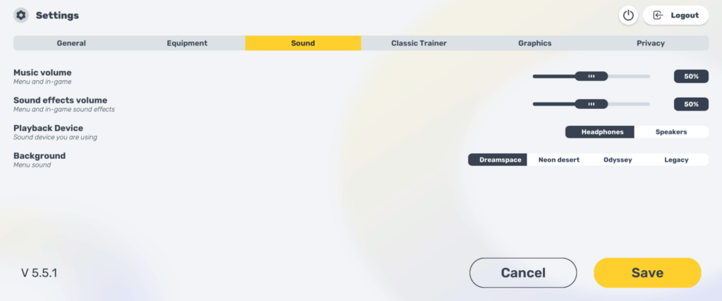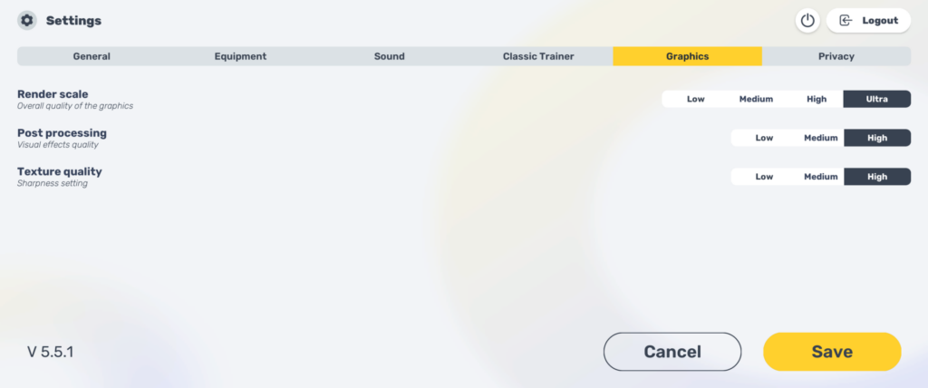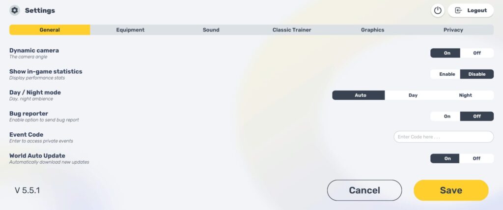 MyWhooshの設定画面では、さまざまなカスタマイズが可能です。設定画面はゲーム内メニューから「Settings」を選択してアクセスします。