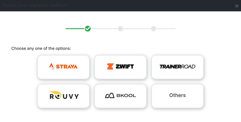 移行元のプラットフォームを選択する画面が表示されます。Zwift以外にもStrava、TrainerRoad、Rouvy、Bkoolからの移行にも対応しています。