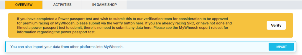 移行はMyWhoosh公式サイトにログインし、プロフィールページのOVERVIEWタブにある「IMPORT」ボタンからデータインポート機能を利用します。