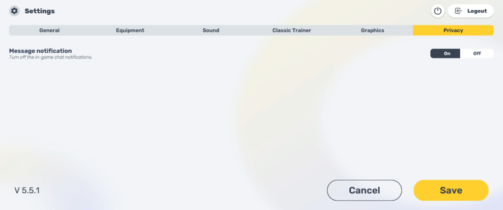 「Privacy」タブでは、ゲーム内チャットの通知をオン/オフできます。集中してトレーニングしたい場合はオフにしておくとよいでしょう。