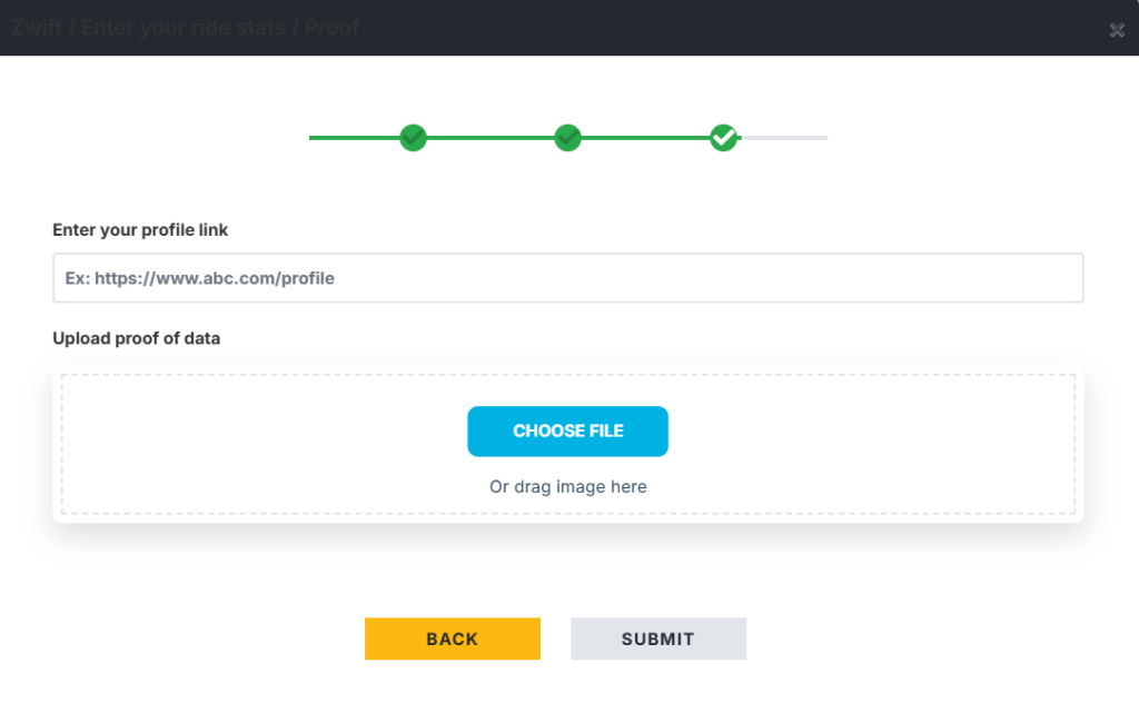 最後に、Zwiftのプロフィールリンクと、統計データのスクリーンショットをアップロードします。プロフィールリンクは「zwift.com/ja/feed」にログインし、右側の「マイプロフィール」をクリックしてプロフィールページを開いたときのURL(例:zwift.com/ja/athlete/xxxxxxxx-xxxx-xxxx-xxxx-xxxxxxxxxxxx)です。証拠画像には、フィード画面右側の統計情報のスクリーンショットをアップロードします。