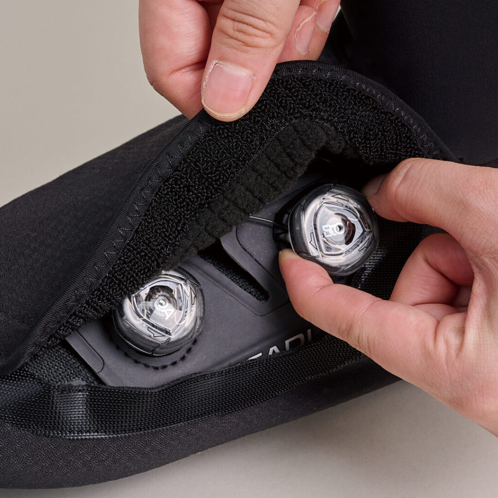 この窓を通して、シューズカバーを着用したまま、BOAダイヤルやバックルなどの調整システムにアクセスできるため、厚手のウィンターグローブを外すことなく、一瞬でフィット感を調整できます。走行中や信号待ちの短時間でも締め付けを微調整できる点が、従来のシューズカバーにはなかった革新性として評価されています。