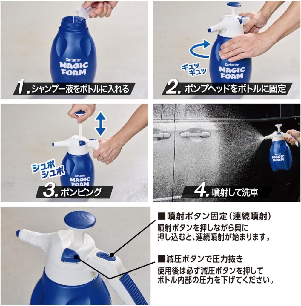 シュアラスター マジックフォーム フォームガン[蓄圧タイプ]は、電源も水道接続も不要で、どこでも手軽に泡洗車ができるフォームガンです。1947年創業の老舗カーケアブランドが開発した製品で、きめ細かい泡がしっかり汚れを浮かせてくれます。