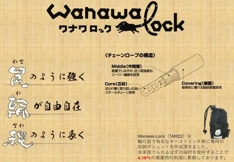 そんな「軽さ」と「強さ」のジレンマを解決するアイテムとして、SNSで話題になっているのがTAMBARの「ワナワロック」です。わずか135gという驚異的な軽さでありながら、ボルトクリッパーでも容易に切断できないという強靭さを実現しています。