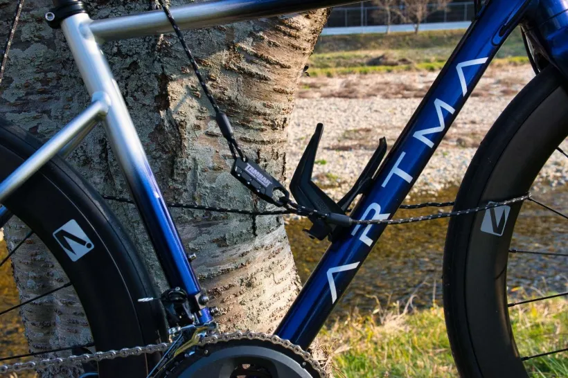 また、フレームだけでなく前後のホイールやヘルメットも一緒に施錠できる長さがあるため、いわゆる「地球ロック」をしながら複数箇所を保護することが可能です。