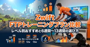 この記事では、ZwiftでFTP向上に効果的な主要トレーニングプランを、期間・強度・ゾーン配分・ユーザーのFTP向上データまで含めて比較します。2026年3月時点の最新情報として、廃止されたプランや新機能についても触れているので、プラン選びの参考にしてください。